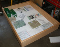 It was time to decide what would be put inside the display. They used pictures of local geocachers on geocache hunts, topographical maps, cache containers, samples of signature items and trinkets. Travel bugs and geocoins were placed inside the exhibit on a glass shelf, facing outward for people to see (and to "discover" via geocaching.com). One item that Rich thought would be a good addition was a GPS. He called up the sales department at Garmin and explained the project. A few days later he received an empty Garmin "yellow" case in the mail.
