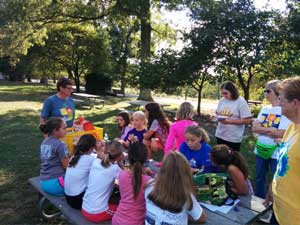 At about 3:30 pm, members of Troop 1247 of St. Clement’s arrived with their leaders and gathered at the picnic tab-2-2le where walkingstic-stl began with introductions of the other SLAGA members who were assisting her, then engaged her students by asking what they already knew about geocaching and GPS units.  The kids enthusiastically responded and asked their own questions.