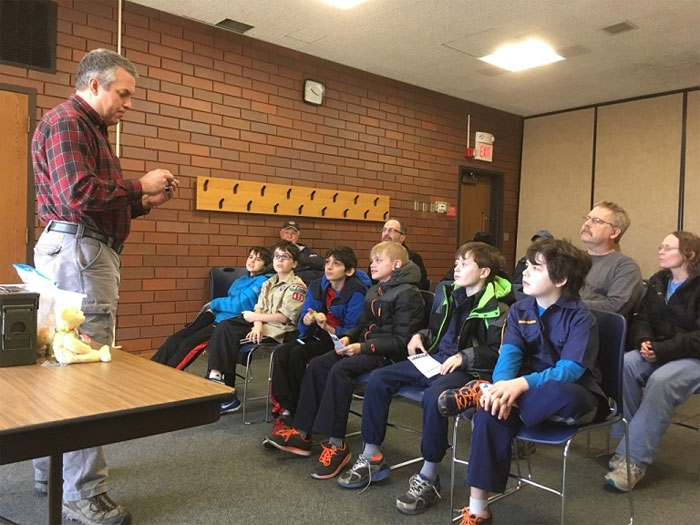 In late November, 2016, Den Leader Larry Willick contacted SLAGA to request a class in geocaching for his Cub Scout Pack. Six scouts and their parents attended the class, held at the Grand Glaize branch of the St. Louis County Library in Manchester, MO. How-D (Bill Lange) spoke to the students for about an hour, covering the basics while illustrating his commentary with samples of cache containers and trackable items.